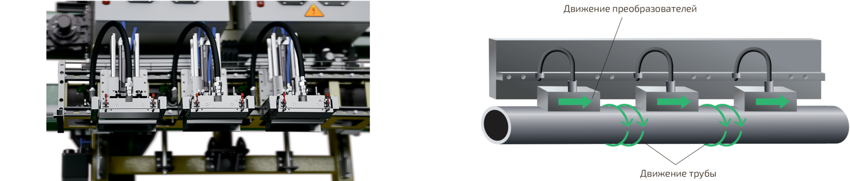 Detection of defects with longitudinal and transverse orientation relative to the pipe axis, as well as oblique defects. Additionally, lamination testing and wall thickness measurement are performed.